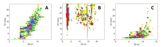 As anticipated and previously noted [59,60,61], the chromatographic peaks in the RPLC × RPLC separations of peptides (Figure 6A) and pharmaceuticals (Figure 7A) are confined to a narrow region and are mainly distributed along an invisible diagonal line that traverses the contour plot. In contrast, the separation space in HILIC × RPLC (Figure 6B and Figure 7B) is more effectively utilized, particularly for peptides, as underlined in previous work [43]. Conversely, in the two revHILIC × RPLC separations (Figure 6C and Figure 7C), the chromatographic peaks appear to be concentrated in the bottom right-hand side of the 2D space, while the upper left corner is empty.