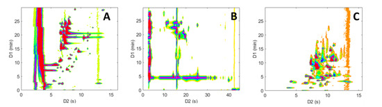 Figure 6 shows a comparison of the resulting contour plots obtained for the analyses of the peptide mixture, while Figure 7 depicts the ones obtained for the pharmaceutical mixture. Initially, it can be noted that the three separations show marked differences, highlighting the distinct selectivity of the three LC modes investigated. Furthermore, it is evident that both the size and the peak occupation of the 2D retention space exhibit significant variations between the different LC × LC configurations, as well as between the two samples.