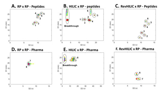 Two dimensional contour plots (HRMS detection) of selected extracted ion chromatograms (EICs) in (A,D) RPLC × RPLC, (B,E) HILIC × RPLC, and (C,F) revHILIC × RPLC for the separation of the representative (A–C) peptide and (D–F) pharmaceutical samples. Extracted ion chromatograms (EICs): 1: 1636.8220, 2: 908.8799, 3: 1383.7090, 4: 1112.5860, 5: 1548.2860, 6: 1585.7750, 7: 260.1651, 8: 272.2015.