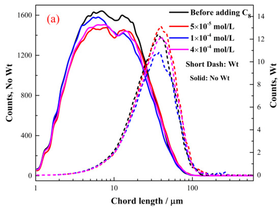 Figure 5(c1) presents the changes in the mean chord length and particle counts when 2 × 10−4 mol/L C8 was used as the collector. At approximately 20:00, the system tended to reach equilibrium, and changes barely occurred. Figure 5(c2) indicates that the peak of the square-weighted counts of CLD shifted from 36 μm at 03:28 to 57 μm at 29:50. Aggregates in the PVM image in Figure 5(c3) were larger than those in Figure 5(c2). This finding indicated that the fine cassiterite particles formed flocs.