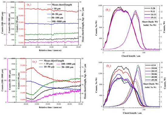 Figure 6 illustrates the flocculation of the cassiterite sample when 1 × 10−5, 2 × 10−5, 4 × 10−5 or 8 × 10−5 mol/L dodecyl hydroxamate (C12) was used as the collector. The PVM images of flocs are displayed in Figure 7. Figure 6(a1,b1) illustrate that hydrophobic flocs did not form after the addition of 1 × 10−5 mol/L C12. Figure 6(a2,b2) indicate that the addition of 2 × 10−5 mol/L C12 caused particles to aggregate slowly. Figure 6(b2) shows that the peak of the square-weighted counts of CLD shifted from 35 μm at 04:14 to 53 μm at 49:38, indicating that the aggregates were small. Small aggregates were observed at 50:00 in the PVM image provided in Figure 7(c1).