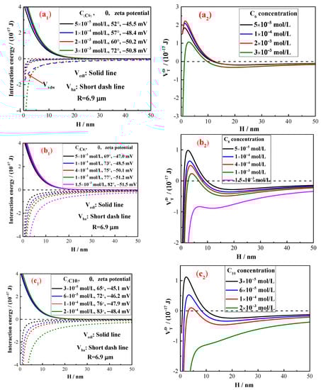 Diagram of the extended DLVO interaction energy as a function of the separation distance between cassiterite particles in the presence of alkyl hydroxamic acids. (C6—(a1,a2), C8—(b1,b2), C10—(c1,c2), C12—(d1,d2)).