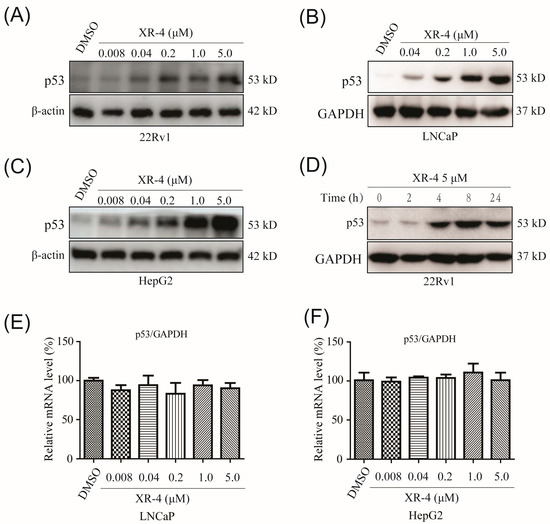 Mechanistically, by binding competitively to the p53 pocket of MDM2, an MDM2 inhibitor could prevent the interaction between MDM2 and p53, resulting in p53 accumulation and translocation [17]. Herein, we first investigated whether XR-4 could promote p53 protein accumulation in different cancer cells. The 22Rv1 cell is a human castration-resistant prostate cancer cell line; this cell line is sensitive to MDM2 inhibitors as it is a p53 wild-type cell line. Western blot analysis showed that XR-4 dramatically and dose-dependently increased the amount of p53 protein after 24 h of treatment in 22Rv1 cells. Surprisingly, XR-4 exerted the activity of activating p53 at a low concentration of 0.04 μM (Figure 2A). The LNCaP cell is a human castration-sensitive prostate cancer cell line; it is also an MDM2 inhibitor-sensitive p53 wild-type cell line. Similar to the results performed in 22Rv1 cells, XR-4 also dose-dependently upregulated the p53 protein levels in LNCaP cells (Figure 2B). The HepG2 cell line is a p53 wild-type human hepatoma carcinoma cell line; thus, then chose this cell line to analyse of the p53 activation activity of XR-4. As is shown in Figure 2C, XR-4 also dose-dependently promoted p53 protein expression in HepG2 cells, and we even observed an upregulation of p53 levels under the 0.008 μM XR-4 treatment. Moreover, we then detected the time–effect relationship of XR-4 in 22Rv1 cells, and we found that under the 5 μM XR-4 treatment for 4 h, the p53 protein levels were significantly upregulated, while it seemed to have no influence on p53 protein levels under the XR-4 treatment for 2 h, and the XR-4 treatment for 8 h was thought to induce the strongest p53 activation activity (Figure 2D). Finally, we detected whether XR-4 influences the mRNA levels of p53 via conducting quantitative polymerase chain reaction (qPCR) analysis; the results indicated that XR-4 had almost no influence on p53 mRNA expression levels under our chosen concentration treatment both in LNCaP and HepG2 cells (Figure 2E,F). Together, our results proved that XR-4 could potently promote p53 protein accumulation in different cancer cells in both dose-dependent and time-dependent manners by blocking the MDM2-p53 interaction.