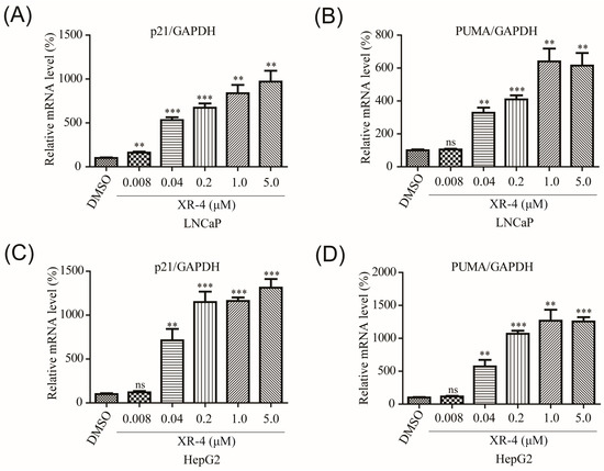 As our previous work demonstrated that XR-4 induced p53 accumulation in cancer cells, we then performed qRT-PCR analysis to investigate the influence of XR-4 on p53 target genes in different cancer cells. The p21 gene is one of the p53 signal pathway downstream genes, and p21 is a crucial cell cycle regulatory gene. It is involved in the process of cell growth, differentiation, senescence, and death and is closely related to tumorigenesis [30]. The qRT-PCR results revealed that XR-4 dose-dependently increased p21 mRNA expression levels, both in LNCaP and HepG2 cells (Figure 3A,C). The p53 downstream target gene, PUMA, plays an important role in mediating p53-induced cell death [31]. Similarly, our qRT-PCR results also revealed that XR-4 could dose-dependently upregulate PUMA mRNA expression levels both in LNCaP and HepG2 cells (Figure 3B,D). These results surely confirmed that XR-4 can activate the p53 pathway.