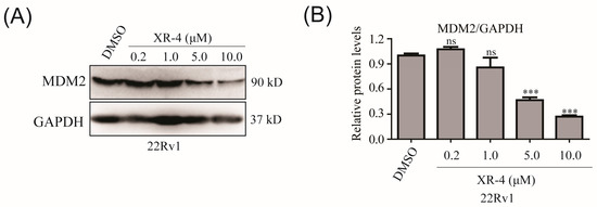 XR-4 downregulates MDM2 protein levels: (A) 22Rv1 cells were treated with XR-4 at the indicated concentrations for 24 h, and the protein levels of MDM2 and GAPDH were determined via Western blotting; (B) ImageJ was used to analyse the relative protein levels. Experiments were performed in triplicates. All results are represented as mean ± SD. *** p < 0.001 vs. the control group.