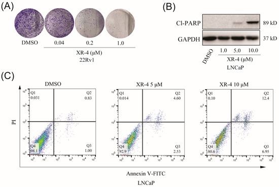 To evaluate the influence of XR-4 on cancer cells’ clone formation ability, 22Rv1 cells were treated with different concentrations of XR-4 for about 2 weeks; the results showed that the XR-4 treatment more effectively reduced the number of 22Rv1 cell colonies in comparison to that of the negative control (Figure 5A). Western blot analysis also indicated that XR-4 could induce the accumulation of cleaved PARP, an apoptotic marker protein, in LNCaP cells in a dose-dependent manner (Figure 5B). Furthermore, flow cytometry analysis also revealed that XR-4 induced LNCaP cell apoptosis (Figure 5C). These results suggest that XR-4 could suppress cell proliferation and induce apoptosis through p53 activation in vitro.