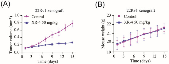 The mice used in this study, 4-6-week-old BALB/c male nude mice, were purchased from Shanghai Laboratory Animal Center (Shanghai, China). The 22Rv1 cells (5 × 106 cells with Matrigel at a ratio of 1:1) were subcutaneously injected into the left flanks of the mice. When the average tumour volumes reached about 100–150 mm3, the mice were assigned randomly to 2 groups consisting of 8 mice each. XR-4 was administered once daily intraperitoneally for 15 days. Tumour volume and mice’s body weight were measured every other day, and data were recorded and are represented as mean ± SD. The tumour volume (V) was calculated using the formula V = (L × W2)/2 (mm3), where L is the longest diameter, and W is the diameter perpendicular to L of the tumour. All animal experiments were approved by the KeyGEN BioTECH Institutional Animal Care and Use Committee (Reference number: IACUC-20210302).