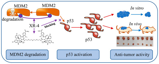 Efforts have been made to develop novel paradigms for designing conceptually distinct MDM2-p53 inhibitors. Through the proteolysis targeting chimeras (PROTACs) strategy, some MDM2-targeted heterobifunctional PROTACs have been designed and show potent MDM2 inhibition activities [23,24]. Interestingly, with MDM2’s twin roles as an E3 ubiquitin ligase and an anticancer target, He et al. reported a series of homo-PROTACs and proved their exhilarating MDM2 self-degradation activity. These MDM2 homo-PROTACs can break down MDM2 proteins without adding additional targets and reducing the possible side effects [25]. As our previous work potently developed selective MDM2 inhibitors of PEGylation spirooxindole derivatives derived from spiroindolinone pyrrolidinecarboxamide compound 2 [26,27,28], here, we developed a dimer, spiroindolinone pyrrolidinecarboxamide XR-4, as a potent MDM2-p53 inhibitor. This compound can specifically block MDM2–p53 interaction, downregulate MDM2 protein levels, and inhibit wild-type p53 cancer cell proliferation activity in vitro. Furthermore, XR-4 has been proven to possess anti-tumour activity in vivo with favourable safety (Scheme 1).