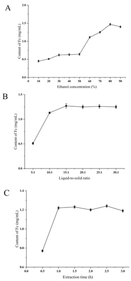 Effect of different extraction factors (A) ethanol concentration, %; (B) liquid-to-solid ratio, and (C) extraction time, h, on the content of Fc.