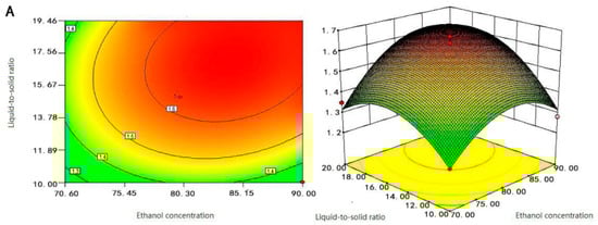 As shown in Figure 3A, when the ethanol concentration was between 75–85%, and the liquid-to-solid ratio was between 14–20 mL/g, the Fc content obtained was the largest. After that, the content of Fc decreased gradually regardless of the increasing or decreasing of ethanol concentration and liquid-to-solid ratio. The contour of the liquid-to-solid ratio axis was denser than that of the ethanol concentration axis, indicating that the effect of liquid-to-solid ratio on Fc content was greater than that of ethanol concentration. It was reported that the liquid-to-solid ratio was relatively small and the viscosity of the solution was larger; there was a low molecular diffusion rate and small extraction rate, and as the liquid-to-solid ratio increased, the velocity of molecular diffusion became faster [35].
