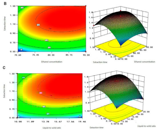 Response surface and contour plots of (A) liquid-to-solid ratio and ethanol concentration, (B) extraction time and ethanol concentration, and (C) extraction time and liquid-to-solid ratio on the content of Fc.