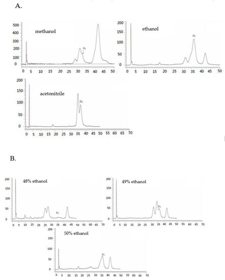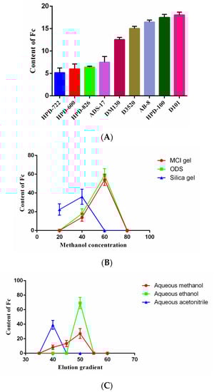 Figure 4C shows that among all the tested solvents, aqueous ethanol possessed the best enrichment effect on Fc, and the elution of Fc using aqueous methanol and aqueous ethanol was found to be in the range of 45−50%, while the aqueous acetonitrile was found in the 40% eluent. It can be seen from Figure 5A that the purity of Fc was low in the aqueous methanol elution fraction and it was difficult to separate. The purity of Fc in the ethanol elution fraction was higher while it was relatively low in acetonitrile elution. The results also showed that the best separation effect of Fc was obtained from aqueous ethanol fraction. The selection agreed with a previous study for the preparative separation of minor saponins from P. notoginseng leaves using aqueous ethanol (v/v) [30]. Moreover, the cost of ethanol is also low; it is easy to recycle, economical, and environmentally friendly.