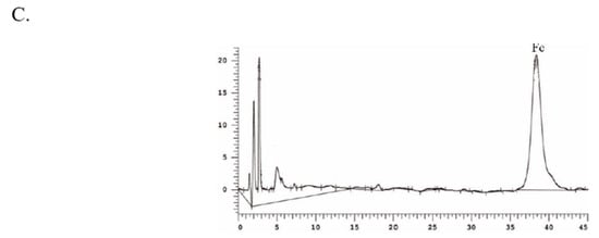 Based on the results and evidence in our study, the separation of Fc fraction enriched by the optimized HPD-100 macroporous resins was revealed as follows. The appropriate elution gradient is essential for the acquisition of target compounds. In addition, 49% and 50% of the aqueous ethanol eluent contained a large amount of Fc (Figure 5B), but the purity of Fc was 28% and 52%, respectively. The impurities with similar polarity cannot be removed, and the effect of purification was not achieved. Referring to Figure 3C, in the fractions of aqueous acetonitrile, impurities similar to the polarity of Fc can be separated. In a sum, the purified Fc by ODS chromatography was eluted 5 bed volume (BV) with 48% aqueous ethanol; the impurities near the Fc were removed. Next, the 35% aqueous acetonitrile solution with high polarity and good separation were applied, and the impurities were removed with 5 BV, then eluted with 40% aqueous acetonitrile solution. The HPLC chromatogram of the Fc obtained from the ODS chromatography can be seen in Figure 5C, which shows that after the combination of aqueous ethanol and aqueous acetonitrile, the purity of Fc surpassed 90%. A higher purity (>95%) of Fc can be obtained by a single crystallization operation. This proves that the elution process was reasonable.