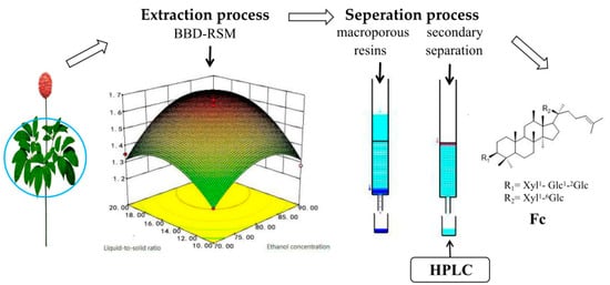 In our study, the ultrasonic extraction process of Fc from P. notoginseng leaves was optimized by using RSM. Due to the single factor test, BBD was designed to evaluate and optimize extraction variables (extraction time, ethanol concentration and liquid-to-solid ratio) to improve the content of Fc. The optimal extraction conditions of Fc were an ethanol concentration of 86%, a liquid-to-solid ratio of 19:1 mL/g, and extraction time of 1.5 h, which resulted in a theoretical optimal value of Fc content of 17.30 mg/g. The separation of Fc was examined using a series of fillers and several series eluents. The optimum macroporous resin for preliminary separation of Fc was HPD-100 resins, using deionized water to remove impurities, and the optimum gradient for eluting the Fc sample solution was 70% ethanol. After the prefractionation of HPD-100 resins, the purity of Fc was greater than 30%. During further enrichment treatment using ODS column chromatography, after elution of 5 BV with 48% ethanol water and then excluding impurity volume of 35% acetonitrile with water, 5 BV; a higher purity Fc (>90%) can be obtained. This was done by eluting with 40% aqueous acetonitrile fraction. Fc with a purity greater than 95% can be obtained by single crystallization operation. The yield of Fc is 0.98% of the extraction and separation process. The proposed method is convenient and quick, and improves efficiency. The process diagram of extraction and separation process of Notoginsenoside Fc from P. notoginseng leaves is in Figure 6.