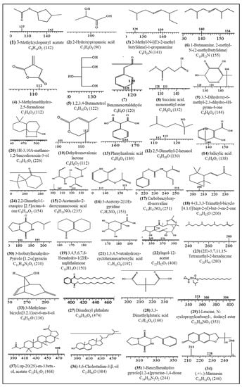 | 18 | 12.611 | 0.70 | 4-(1,3,3-Trimethyl-bicyclo[4]hept-2-yl)-but-3-en-2-one | Sesquiterpene |