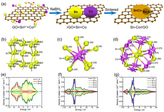 The schematic sketch of Sn–Co alloy/rGO composite (a), the crystal structure (atomic population) (b) and density of states (e) for pure Sn, the crystal structure (atomic population) (c) and density of states (f) for CoSn2 intermetallics, the crystal structure (atomic population) (d) and density of states (g) for CoSn intermetallics.