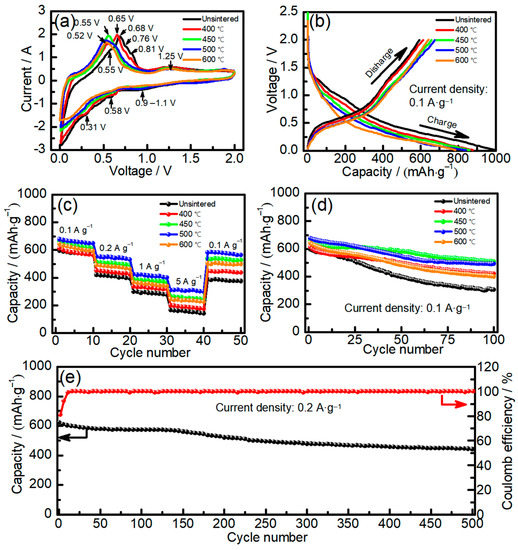 The cyclic voltammetry curves of Sn–Co alloy/rGO composite (a), the constant current charge–discharge curves of Sn–Co alloy/rGO composite (b), the cycle performance curves of Sn–Co alloy/rGO composite (c), the rate performance curves of Sn–Co alloy/rGO composite (d), the long cycle test of Sn–Co alloy/rGO composite sintered at 450 °C (e).