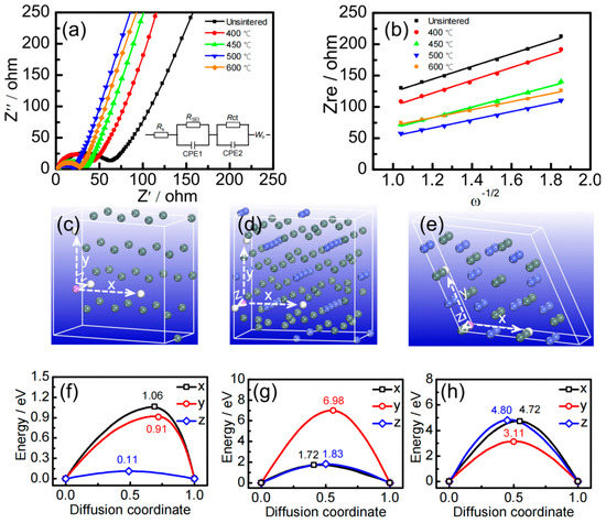 The AC impedance spectra (a) and fitting curve (b) of Sn–Co alloy/rGO composites, the diffusion direction (c) and diffusion energy barrier (f) for pure Sn, the diffusion direction (d) and diffusion energy barrier (g) for CoSn2 intermetallics, the diffusion direction (e) and diffusion energy barrier (h) for CoSn intermetallics.