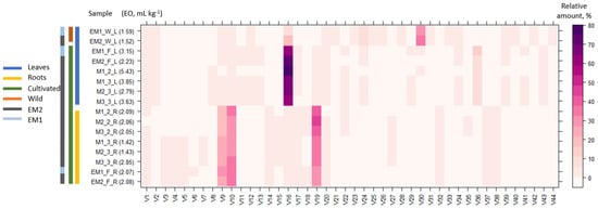 Essential oil content (mg mL−1) (EO) and heatmap of the chemical components of the essential oil of wild and field-grown E. maritimum over different samples and sample parts. The legend denotes scaled relative amounts of the volatile chemical constituents (V1–V44, according to Table 1). The deep purple color indicates higher concentrations, whereas the pale pink color indicates lower corresponding values.