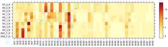 Variation in the non-volatile chemical components of the aqueous ethanolic extracts of E. maritimum roots over different samples. The legend denotes scaled relative amounts (%) of the non-volatile chemical constituents (Table 3). The deep red color indicates higher concentrations, whereas the pale yellow-to-orange color indicates lower corresponding values.