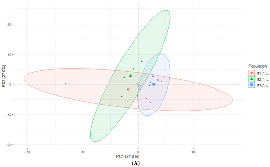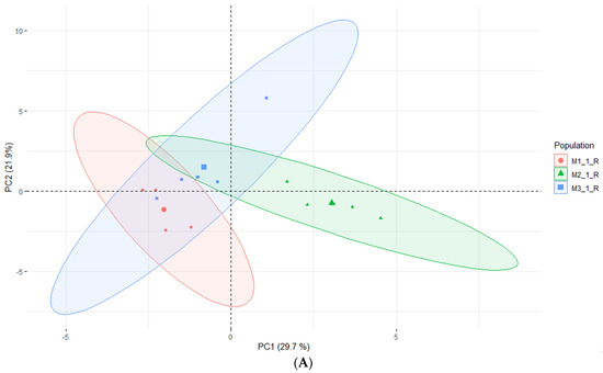 The next dominant phytochemical group was hydroxycinnamic acid derivatives (HC), which include such compounds as neochlorogenic acid (NV21), chlorogenic acid (NV22), rosmarinic acid (NV49), and ferulol (NV43). This phytochemical class is one of the most often reported in E. maritimum samples [8,12,13,14,30,31]. The mean values of chlorogenic acid (CA) were generally higher in all our tested E. maritimum extracts, ranging from 15.0 mg to 5.75 g in 100 g DW, in comparison with rosmarinic acid (RA), ranging from 0.6 mg to 1.2 g in 100 g DW. However, in both cases, the most significant amounts appear in the roots of in vitro-cultured plants (M1_(1);(2);(3)_R). ANOVA revealed significant differences (p < 0.05) among growth conditions, while there were no significant differences between populations and plant parts. Large scale and long-term studies have been conducted to investigate the importance of RA and CA biosynthetic pathways in plants [49,50,51]; however, one thing is clear: regardless of the species, in plants these compounds can serve as one of the quality markers at every stage of plant development. According to Kikowska [6], RA and CA can be used as marker compounds to reveal how well different supplements work for E. maritimum micropropagation in vitro. By changing the concentration of auxins (indole-3-acetic acid (IAA), indole-3-butyric acid (IBA), or 1-naphthaleneacetic acid (NAA)) added, the concentration of RA and CA can be changed from 0.002 to 0.743 mg in 1 g DW. In the same study, similar relationships were observed: roots from in vitro-regenerated plants contain much higher yields of RA and CA compared with those from field-grown plants, while the concentration amounts between RA and CA were opposite to our study. No less important and characterized by a wide range of compounds is the class of flavonoids (F), which consists of fifteen separate compounds in total, mostly recognized as kaempferol, quercetin, luteolin, and isorhamnetin derivatives. It is believed that this compound class is among the ones contributing to antioxidant properties in a wide range aromatic plants used in the industries of food, pharmacy, and cosmetics [32]. E. maritimum is no exception, and the composition of flavonoids in it has been widely studied [12,15,20,27,30]. Although most of the authors performed spectrophotometric quantification of total flavonoids, finding their concentrations to be 24.3 mg quercetin equivalents (QE) in 1 g DW [41], 22 mg QE in 1 g DW [15], and 1.5 mg rutine equivalents (RE) in 1 g DW [13], estimation of total flavonoid amount using HPLC gave even lower amounts in the range of 0.29 to 0.34 mg in 1 g DW (originally 29.12 mg to 34.37 mg in 100 g DW) [7]. The observed trends are similar to our study: in the root samples they are found in a smaller number and yields compared to the leaf extracts. Because the separation and detection of triterpene saponins (TT) depend on several different parameters in the sample extraction process, as has already been said, we used spectrophotometric analysis to determine their total amount (TSC) in our study. With the help of the LC-qTOF-MS method, eryngioside derivative triterpenoids were found to be the most common saponins in the tested samples. Seven of them (NV56–NV59, NV61–NV63) were separated from E. maritimum tested extracts, but the presence of these compounds is mostly confirmed in other species, such as E. yuccifolium [52], E. alpinum [31], and E. planum [35]. According to Wang [23], eryngioside J and eryngioside L extracted from E. campestre showed moderate cytotoxic properties against different cell lines such as PANC-1, A-549, PC-3, HL-60, and MRC-5, indicating that triterpenoid saponins may provide an interesting lead for cancer drug development.