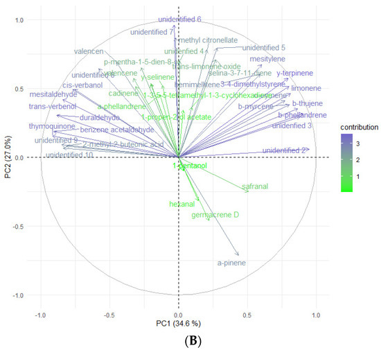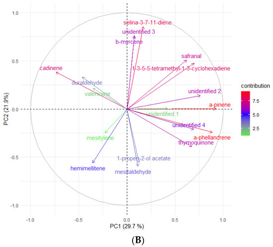 Principal component analysis (A) and contributions (B) referred to the main volatile organic compounds detected in the fresh roots of E. maritimum in vitro samples.