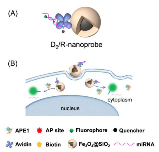(A) Schematic representation of the AP site-containing DNA/RNA hybrid (D0/R) nanoprobe; (B) Fluorescence imaging of APE1 activity in live cells by using the D0/R-nanoprobe.