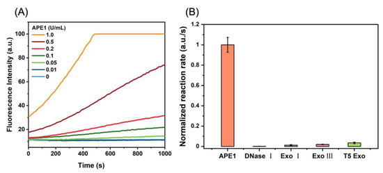 (A) Fluorescence curves of the reactions between D0/R-nanoprobe (100 μg/mL) and APE1 at different concentrations. (B) Selectivity of D0/R-nanoprobe (100 μg/mL) toward APE1 (1.0 U/mL) over other nucleases (DNase I: 1.0 U/mL; Exo I: 2.5 U/mL; Exo III: 20 U/mL; T5 Exo: 1.0 U/mL) in Buffer 1.1 + 0.02% Triton X-100. All experiments were repeated at least three times.