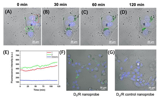 To monitor the intracellular activity of APE1 in real time, we delivered the D0/R-nanoprobes into MCF-7 live cells (Figure 1B). After magnetic transfection with 100 μg/mL D0/R-nanoprobes for 2 h, the probes were efficiently internalized by MCF-7 cells and emitted bright fluorescence signals in the cytoplasm (Figure 3A). Continuous imaging was performed over a period of 120 min, with images acquired at 30 min, 60 min and 120 min after the 2 h transfection shown in Figure 3B–D and Figure S5, respectively. Over time, the nanoprobes accumulate in the perinuclear region of cytoplasm and emit increasingly bright fluorescent signals. Due to their relatively large size (25 ± 3 nm) and spheric shape [16,17] the D0/R-nanoprobes are unable to passively diffuse through the nuclear pore and enter the nucleus.