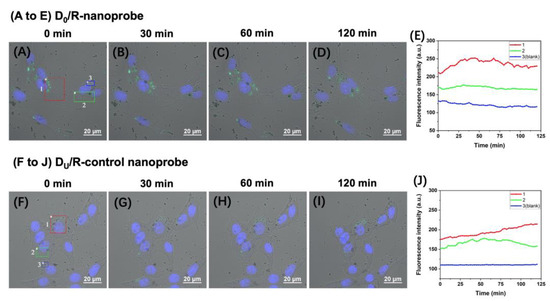 Time-lapse fluorescence imaging of the APE1 activity (green) in PC-12 live cells by using the D0/R-nanoprobes (A–D) and DU/R-control nanoprobes (F–I), respectively. (E) Time courses of the fluorescence intensity of the three representative regions in PC-12 live cells transfected with D0/R-nanoprobes. (J) Time courses of the fluorescence intensity of the three representative regions in PC-12 live cells transfected with DU/R-control nanoprobes. The cells were incubated with 100 μg/mL of the nanoprobes for 120 min and analyzed by confocal microscopy. Hoechst 33342 was used to stain the nucleus (blue).