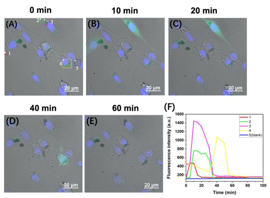 (A–E) Monitoring of the variation of APE1 activity in PC-12 live cells under the treatment with tert-butyl hydroperoxide (tBHP). (F) Time courses of the fluorescence intensity of the five representative regions in PC-12 live cells transfected with D0/R-nanoprobes. The cells were incubated with 100 μg/mL D0/R-nanoprobe for 120 min. tBHP was added to the imaging medium at a concentration of 2.5 mM after the magnetic transfection of D0/R-nanoprobe. Hoechst 33342 was used to stain the nucleus (blue).