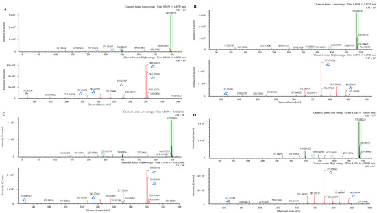 Comparison of reference materials quercetin-3-O-α-l-rhamnoside (A) and amentoflavone (B) to identify the components of peak 4 (C) and peak 7 (D) using mass spectra obtained by UPLC-QTOF-MS.
