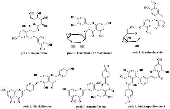 Peak 3 (observed RT: 4.84 min; formula: C21H20O12) was identified as isoquercetin, as reported in [15,16]. The precursor ion of this component was detected at m/z 463.0878 [M − H]− ion, with a fragment ion at m/z 300.0267 [463–C6H12O5]− with the main peak. Isoquercetin has been reported to inhibit the oxidative stress effect of multiple carcinogens [21,22]. Peak 4 (observed RT: 5.34 min; formula: C21H20O11) was identified as quercetin-3-O-α-l-rhamnoside, as reported in [16,17,18]. The precursor ion of this component was detected at m/z 447.0929 [M − H]− with fragment ions at m/z 300.0266 [447–C6H12O4]− and 243.0299 [447–C8H13O6]− and the main peak at m/z 300.0266. Quercetin-3-O-α-l-rhamnoside has been reported to have cytotoxic effects and antibacterial and antioxidant activities [23,24,25]. Peak 5 (observed RT: 5.94 min; formula: C26H32O11) was identified as matairesinoside, as reported in [19]. The precursor ion of this component was detected at m/z 519.1870 [M − H]− with fragment ions at m/z 357.1340 [519–C6H11O5]− and 343.1104 [519–C7H14O5]− and the main peak at m/z 357.1340. Matairesinoside has been reported to have cytotoxic effects and antibacterial activity [26]. Peak 6 (observed RT: 7.78 min; formula: C30H18O10) was identified as hinokiflavone, as reported in [20]. The precursor ion of this component was detected at m/z 537.0826 [M − H]− with fragment ions at m/z 443.0489 [537–C6H7O]−, 375.0510 [537–C9H7O3]−, and 117.0346 [537–C22H13O9]− and the main peak at m/z 375.0510. Hinokiflavone has been reported to have cytotoxic effects and anti-inflammatory and antioxidant activity [27,28]. Peak 7 (observed RT: 8.42 min; formula: C30H18O10) was identified as amentoflavone, as reported in [16,18,20]. The precursor ion of this component was detected at m/z 537.0826 [M − H]− with fragment ions at m/z 443.0409 [537–C6H7O]− and 375.0510 [537–C9H7O3]− and the main peak at m/z 375.0510. Amentoflavone has been reported to have various bioactivities, including antioxidant, anti-inflammatory, anti-senescence, antitumor, anti-virus, and anti-fungal effects [29,30,31,32]. Peak 9 (observed RT: 9.97 min; formula: C31H20O10) was identified as podocarpusflavone A, as reported in [20]. The precursor ion of this component was detected at m/z 551.0984 [M − H]− with fragment ions at m/z 519.0713 [551–CH5O]− and 375.0506 [551–C21H11O7]− and the main peak at m/z 375.0506. Podocarpusflavone A has been reported to have cytotoxic effects and antimicrobial activity [33,34]. Of the 10 compounds identified in this study, six were confirmed to be flavonoid and lignan-based components which have diverse physiological activities according to the literature.