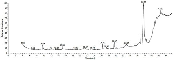 On the other hand, it was found through GC-MS analysis that the n-hexane extract of T. purpurea subsp. apollinea had 17 identified components (Table 2, Figure 3 and Figure 4). These detected components were classified into esters, hydrocarbons, diterpenes, steroids, fatty acid amide, phenols, and other organic compounds. The identified fatty acid methyl esters were 9,12,15-octadecatrienoic acid methyl ester, with relative abundance (RA) of 0.67%), hexadecanoic acid methyl ester (RA = 0.37%), methyl stearate (RA = 0.07%), and cis-5,8,11-eicosatrienoic acid methyl ester (RA = 0.08%), while the identified esters were pentafluoropropionic acid octadecyl ester (RA = 0.17%), 4-ethylbenzoic acid undec-2-enyl ester (RA = 0.05%), acetic acid, 10,11-dihydroxy-3,7,11-trimethyl-dodeca-2,6-dienyl ester (RA = 0.08%), and the identified phthalate ester was a bis(2-ethylhexyl) phthalate (RA = 0.35%). The identified acyclic diterpene was a phytol (RA = 0.61%). The plant extract also contained alkanes tetradecane (RA = 0.08%), pentadecane (RA = 0.20%), 2-methyltetracosane (RA = 0.18%), and the identified aliphatic hydrocarbon was heneicosane (RA = 0.60%). The plant extract contained long-chain alcohol 1-heptacosanol (RA = 0.43%), fatty acid amide palmitoleamide (RA = 0.13%), phenol 2,4-di-tert-butylphenol (RA = 0.08%), and steroid gamma-sitosterol (RA = 0.05%). Additionally, another organic compound found in the extract was tributyl acetylcitrate (RA = 0.04%).