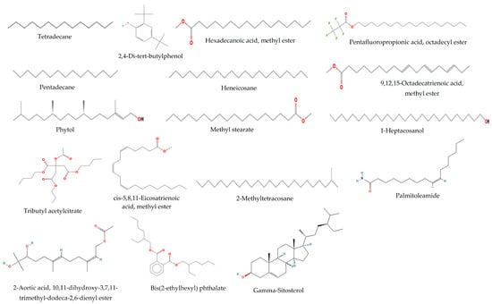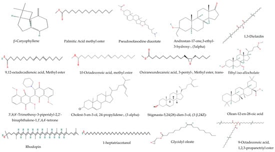 The chemical structures of the chemical compounds identified from methanol extracts from T. purpurea subsp. apollinea via GC/MS.