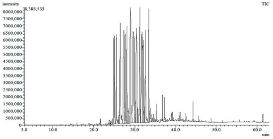 A TRACE 1310 gas chromatograph connected to an ISQLT MS single quadrupole mass spectrometer (Thermo Fisher Scientific, Waltham, MA, USA) was used. The data were obtained from the GC-MS at 70 eV ionization voltage, EI ionization mode, DB5-MS column with an internal diameter of 0.25 mm (J & W Scientific, Folsom, CA, USA), and the temperature was programmed in this manner: 3 min at 40 °C, 5 min at 280 °C, 1 min at 290 °C and constant at 7.5 °C/min. The detector and injector temperatures were adjusted to be 300 and 200 °C, respectively. The flow rate of the carrying gas (helium) was constant at 1 mL/min. The WILEY and NIST Mass Spectral Data Base was used as a search library [].
