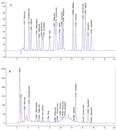 The phenolic compounds were investigated with HPLC reagents (acetonitrile, methanol, and trifluoroacetic acid) purchased from SDS (Peypin, France). The distilled water was obtained from Milli-Q (Millipore, MA, USA). All standards used (methyl gallate, coffeic acid, etc.) were provided by Sigma (St. Louis, MO, USA) and had a 98% level of purity [,].