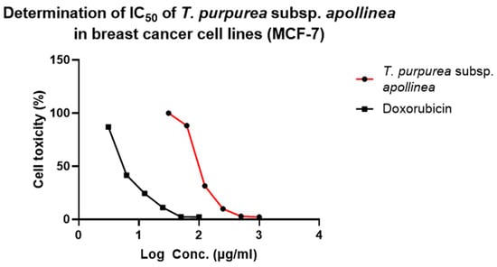 The half-maximal inhibitory concentration (IC50) was determined by plotting the logarithmic concentration of T. purpurea subsp. apollinea extract on the X-axis, and % cytotoxicity on the Y-axis. For example, T. purpurea subsp. apollinea showed IC50 of 102.85 ± 0.58 μg/mL against MCF-7, while doxorubicin, a positive control, showed IC50 of 7.43 ± 0.11 μg/mL (Figure 7).