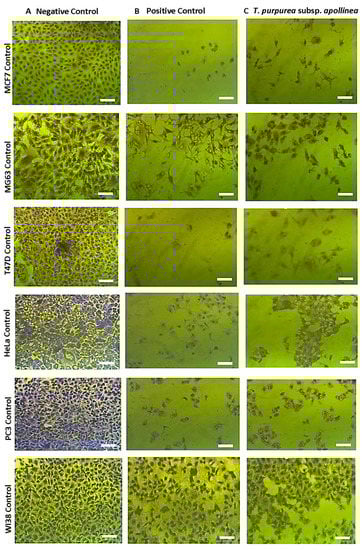 Anticancer effects of T. purpurea subsp. apollinea methanolic extract on cancer cell lines. (A) Complete monolayer sheets are seen in all cancer cell lines that have not been treated; (B) Doxorubicin (250 µg/mL) treatment results in rounded and shrunk cells in all cancer cell lines; (C) Shrunk cells are observed in MCF7, MG63, T47D, HeLa, and PC3 cell lines treated with T. purpurea subsp. apollinea (250 µg/mL); however, small morphological changes in WI38 are observed. The scale bar = 100 µm.