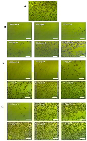 An example of anticancer effect of T. purpurea subsp. apollinea methanolic extract on breast cancer cell line (MCF7). (A) Complete monolayer sheets of breast cancer cells (MCF7) that have not been treated; (B) The effect of doxorubicin treatment at different concentrations; (C) The effect of T. purpurea subsp. apollinea extract on MCF7 cell lines at different concentrations; (D) The effect of T. purpurea subsp. apollinea extract on normal human fetal lung fibroblast (WI38). The scale bar = 100 µm.