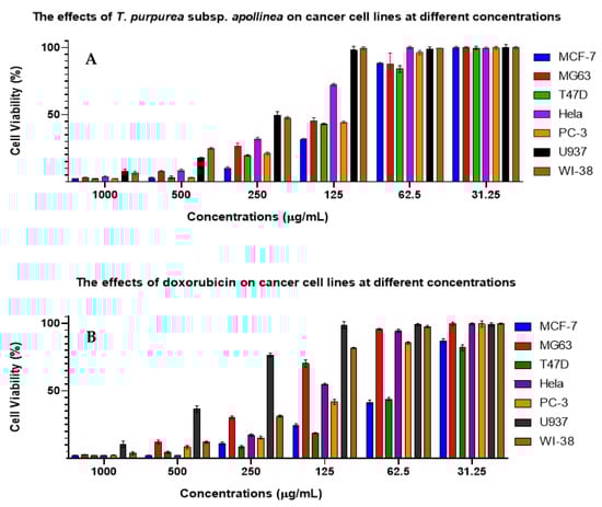 (A) The effects of T. purpurea subsp. apollinea methanolic extract on breast cancer (MCF7), osteosarcoma (MG63), breast ductal carcinoma (T47D), cervical cancer (HeLa), prostate cancer (PC3), leukemia (U937), and normal human fetal lung fibroblast (WI38). (B) The effect of doxorubicin on cancer cell lines.