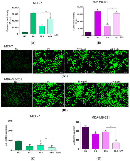 Evaluation of ROS production and GSH levels in breast cancer cells following BCP-1 treatment. Cells were treated with the IC50 and 2 × IC50 (µM) of BCP-1 for 48 h. H2O2 (200 µM) was used as the positive control (PC). (A,B) The cell-permeant indicator for ROS, H2DCFDA; (A1,B1) fluorescence images captured by microscopy; (C,D) GSH levels determined in the cell lysates. Fluorescence intensity was obtained by reading on a spectrofluorometer. Data are expressed as the mean ± SD of three independent experiments that were performed in triplicate. # p < 0.05, compared to the negative control (NC); α p < 0.05, between the IC50 and 2 × IC50 (one-way ANOVA followed by Tukey post-test). Scale bar: 50 μm.