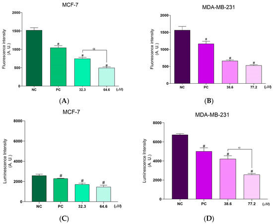 Assessment of ΔΨm and intracellular ATP levels in breast cancer cells following BCP-1 treatment. Cells were treated with the IC50 and 2 × IC50 (µM) of BCP-1 for 48 h. The positive controls (PC) were either (A,B) CCCP (100 µM) or (C,D) KCN (200 µM). (A,B) Fluorescence intensity of the cationic marker TMRE and (C,D) luminescence of the CellTiter-Glo® reagent were determined in a microplate reader. Data are expressed as the mean ± SD of three independent experiments that were performed in triplicate. # p < 0.05, compared to the negative control (NC); α p < 0.05, between the IC50 and 2 × IC50 (one-way ANOVA followed by Tukey post-test).