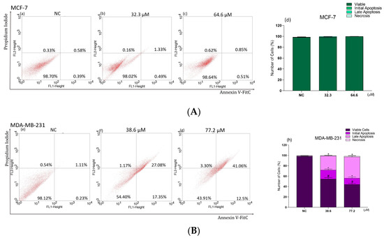 In contrast, treatment of MDA-MB-231 cells resulted in increases in the percentage of cells positive for annexin V alone and both annexin V and PI (Figure 8B(f,g)), in comparison to the NC (Figure 8B(e)). Cells labeled only with annexin V increased by approximately 17% and 12%, while cells with double labeling of annexin V and PI increased by 27% and 41% for the IC50 and 2 × IC50 treatments, respectively (Figure 8B(h)). Cells labeled with PI alone showed no significant increase in relation to the NC (Figure 8B(h)).
