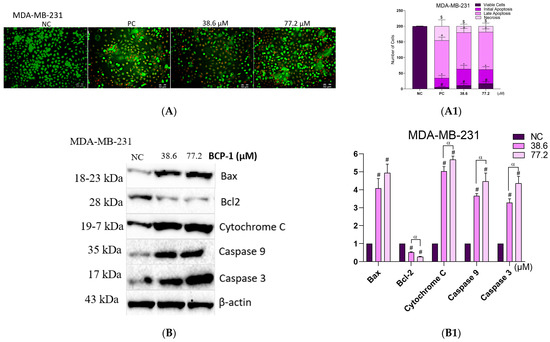 As MDA-MB-231 cells exhibited characteristics of cell death via the apoptotic pathway, evaluation of apoptosis by AO and PI labeling and the expression of apoptosis-related proteins was performed. The labeling with AO/PI demonstrated that the percentage of viable cells after the two treatments with BCP-1 and the PC (CPT) decreased by approximately 90% in relation to the NC. Cells in early apoptosis increased by approximately 1600%, 1380%, and 866% after treatment with the IC50, 2 × IC50 of BCP-1, and the PC, respectively, in relation to the NC. Further, increases in cells in late apoptosis of 3700%, 3900%, and 4000% were also observed following treatment with the IC50, 2 × IC50 of BCP-1, and the PC, respectively, in relation to the NC (Figure 9A,A1).