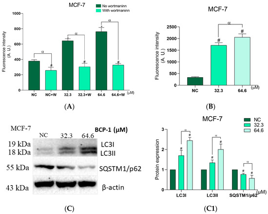 As MCF-7 cells did not present features of cell death via the apoptotic pathway, and to determine the type of death triggered by BCP-1 in these cells, we evaluated the number of autophagic vacuoles and acidic organelles, as well as the expression of proteins related to autophagy. The presence of autophagic vacuoles was analyzed using the MDC marker and MCF-7 cells after treatment with the IC50 and 2 × IC50 of BCP-1 showed an increase in fluorescence intensity of 70% and 102%, respectively, in relation to the NC (Figure 10A). The autophagy inhibitor wortmannin was able to prevent the formation of autophagic vacuoles after BCP-1 treatment, decreasing fluorescence intensity by 53% for the IC50 and 55% for 2 × IC50 compared to the respective treatments without wortmannin (Figure 10A). Furthermore, the NC with wortmannin showed a decrease in fluorescence intensity of 28% compared to the NC without wortmannin (Figure 10A).