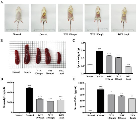 The anti-AD effects of WIF were evaluated using a 2,4-dinitrochlorobenzene (DNCB)-induced AD-like mouse model. After 30 days of induction and oral administration (WIF: 100, 200 mpk, DEX: Dexamethasone 1 mpk, mpk: mg/kg), morphological changes were observed, and spleen weight and serum immunoglobulin E (IgE) and tumor necrosis factor-alpha (TNF-α) levels were measured. WIF treatment alleviated typical AD symptoms, such as surface erythema, edema, and eczematous skin lesions, compared with the control group that received no treatment (Figure 1A). The spleen mass and weight of the control group that received DNCB significantly increased compared with the normal group (Figure 1B,C). However, WIF-treated mice exhibited a slight but significant decrease in spleen weight compared with the control group. In WIF-administered mice, the serum IgE and TNF-α levels were significantly lower than those of the control group (Figure 1D,E).
