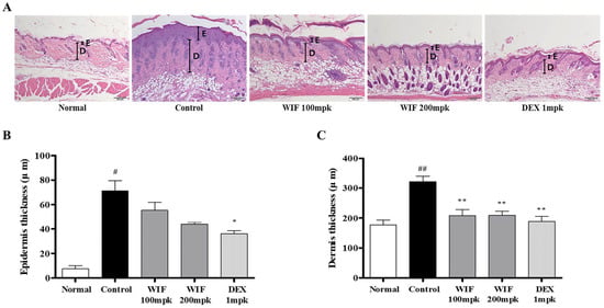To investigate the effects of WIF on the skin of the AD-like mouse model, the dermal and epidermal thicknesses of the skin of the mice were determined via hematoxylin and eosin (H&E) staining. The epidermis and dermis were abnormally thickened in the control group that received DNCB (Figure 2A). Conversely, in WIF-administered mice, abnormal thickening was significantly alleviated in the epidermis (200 mpk) and dermis (100 and 200 mpk; Figure 2B,C). In Figure 2A, boldfaced E and D represent the epidermis and dermis, respectively.