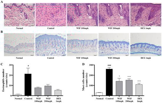 Mice used in this experiment were 6-week-old male BALB/c mice (about 18–20 g) purchased from Samtako Bio Korea (Osan, Republic of Korea). All animal experiments were approved by the Institutional Animal Care and Use Committee (IACUC; D-21-044) of the Korea Institute of Oriental Medicine (KIOM). All animals were maintained under constant conditions of 42.6 ± 1.7% humidity, 22.5 ± 0.5 °C temperature, and a 12 h light-dark cycle. The mice were randomly divided into five groups: normal (negative control), control (positive control; DNCB sensitized), WIF 100 mpk (DNCB + 100 mg/kg WIF), WIF 200 mpk (DNCB + 200 mg/kg WIF), and DEX (dexamethasone; DNCB + 1 mg/kg DEX; positive control). For anesthesia, about 250 mg/kg of avertine (2,2,2-tribromoethanol) diluted in 2-methyl-2-butanol was intraperitoneally injected. Following euthanization, the dorsal skin tissues of the mice were collected and fixed in 10% neutral buffered formalin at room temperature for 24 h and embedded in paraffin. The fixed samples were submitted to a commercial company (Garam Meditech, Dae-gu, Republic of Korea) for H&E and toluidine blue staining. Mast cells and eosinophils infiltrating the dermis were observed under light microscopy, and the skin thickness and number of inflammatory cells were measured using ImageJ version 1.46 (National Institutes of Health). The experimental method was performed in the same way as previously reported [32].