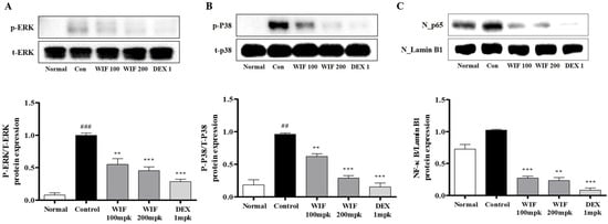 Effects of WIF on MAPK/NF-κB activation in DNCB-induced AD skin lesions. (A–C) Expression of MAPK (ERK and p38) and NF-κB was determined via Western blot analysis. Results are presented as mean ± SD (n = 5 per experiment). ## p < 0.05, ### p < 0.001 vs. normal group; ** p < 0.01, *** p < 0.001 vs. DNCB-induced group.